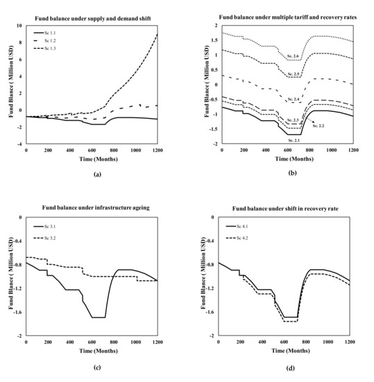 The FWSS fund balance analysis (Figure 4) reveals a continuous deficit under increasing OpEx with ageing infrastructure and current revenue generation trends. The monthly HH water tariff of three dollars and the total recovery rate of 50% are too low to generate enough revenue to cover the OpEx. The OpEx reached up to USD 2.05 million by the service life of the infrastructure (t = 600–721). Infrastructure is assumed to be rehabilitated/replaced after 100 years, resulting in a reduced OpEx. However, the CapEx of the new or rehabilitated infrastructure has not been incorporated in the model for the reasons explained in Section 2.2.4. Revenue is observed to be continuously increasing, primarily driven by population growth. However, it is not enough to balance the OpEx until the first 100 years of infrastructure age have elapsed. The impact of demand shift (as discussed in Figure 3b) on recovery rate and the resulting value of revenue is observed for supply and demand change scenarios (Figure 4a) and income change (Figure 4b). Informal demand increases above 50% of the total earlier demand under income change, resulting in reduced revenue at t = 229. The downward shift of revenue under supply and demand change scenario is being observed at time 1045 (Year 2094). Fund balance is observed increase after 100 years of infrastructure age. This happens as a result of decreasing OpEx due to rehabilitated infrastructure and increased revenue associated with population growth. The impact of demand shift under income change decreases the revenue by 20% from t = 229 to 1045.
