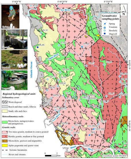 - Pedrosa, M.Y.; Brites, J.A.; Pereira, A.P. Carta das Fontes e do Risco de Contaminação da Região de Entre-Douro-e-Minho. Folha Sul, Escala 1/100000, Nota Explicativa; Instituto Geológico e Mineiro: Lisboa, Portugal, 2002. [Google Scholar]