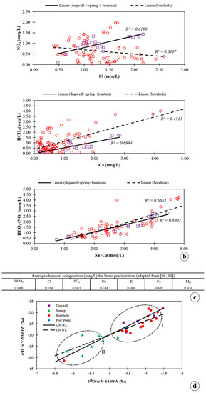 - The isotopic signatures of the groundwaters characterize a meteoric origin, since most of the water samples are positioned very close to the Global Meteoric Water Line (GMWL), defined by [89] and later improved by [90,91,92], and similar to the isotopic composition of the precipitation water samples, from the Portuguese Isotopes in Precipitation Network [93]. From the isotopic point of view, the following two main groundwater clusters have been identified: Group I stands for groundwaters collected from dug wells and boreholes, which presents a more enriched isotopic composition, similar to the Porto precipitation [93], corresponding to normal deviations related with seasonal variations of δ18O and δ2H on precipitation; Group II is composed of the spring samples and presents more depleted δ18O and δ2H values, which may be attributed to the fact that they could be ascribed to random precipitation events, resulting into a direct infiltration of meteoric waters along the fractured granitic rocks;