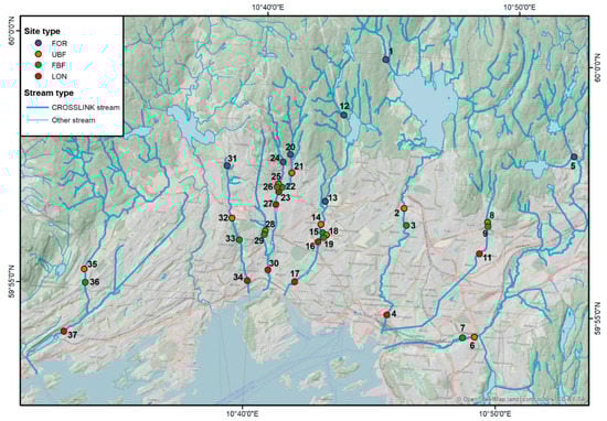 Our research was conducted as part of the European BiodivERsA project CROSSLINK using the tiered study design described in Burdon et al. [14]. The CROSSLINK paired approach explores aspects of lateral and longitudinal connectivity. In our study, we investigated 10 pairs of unbuffered and buffered sites (20 in total) in the Oslo urban area. Within each pair, an upstream unbuffered site (further abbreviated as UBF) was selected with no woody riparian buffer or only a few shrubs and small trees (e.g., Alnus incana, Fraxinus excelsior, and Acer platanoides; Diameter at Breast Height, DBH < 5 cm). A downstream forested buffered site (FBF) was selected with a woody riparian buffer consisting of large trees (DBH > 5 cm) on both banks. The minimal buffer length was 50 m moving upstream from the downstream end of the sampling reach, and the buffer width was 2–3× wetted stream width.