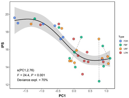 Generalized additive model showing adverse impacts of decreasing water quality on diatom communities in the Oslo basin. The non-linear decrease of the IPS index (L´Indice de Polluosensibilité Spécifique, aka the Specific Pollution Sensitivity Index [34]) is a response to increasing catchment urbanization (PC1). Site types are indicated by different colors; dashed lines indicate site pairs.