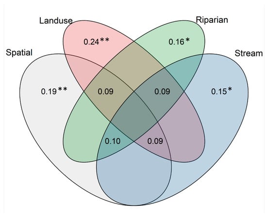 Variation partitioning (PSM2) using four groups of predictors (Spatial, Land use, Riparian, and Stream [Instream habitat + Water quality]) showed the significant independent effects of Spatial (F5,6 = 2.04, p < 0.05), Land use (F2,6 = 3.35, p < 0.01), and Stream (F4,6 = 1.92, p < 0.05), each explaining 15–24% of the total variation in the diatom community structure (Figure 3). In PSM2, riparian habitat independently explained 16% of total variation (F2,5 = 2.54, p < 0.05). Riparian habitat, stream factors, and spatial location combined explained 10% of total variation, indicating spatial autocorrelation of local stream–riparian impacts. The unexplained (residual) variation was 41%. For the results from PSM1, see Appendix B, Supplementary Materials.