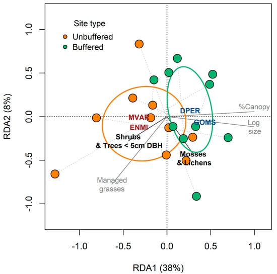 Partial redundancy analysis (pRDA) of diatom communities at site pairs revealed the influence of riparian attributes after conditioning out confounding spatial and environmental factors. Riparian attributes used in the pRDA are shown in black. We also correlated additional riparian attributes that intuitively are associated with forested riparian buffers and unbuffered, upstream reaches (‘envfit’; Log size, R2 = 28.7%, p < 0.05; % Canopy cover, R2 = 10.4%, p = 0.391; and % Managed grasses, R2 = 24.9%, p = 0.084). Indicator diatom species for unbuffered sites were Encyonema minutum (ENMI) and Melosira varians (MVAR), whereas Humidophila perpusilla (DPER, in OMNIDIA as Diadesmis perpusilla) and Gomphonema spp. (GOMS) were characteristic of buffered sites.