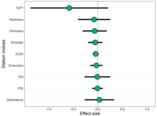 Effect sizes for differences in diatom-based indices between 10 pairs of unbuffered and buffered sites. Indices include standard diatom indices and α-diversity metrics. Only %PT showed a moderate negative effect size with present of riparian buffer. Effect sizes are expressed as mean log response ratios (with 95% CI). Rareness = Fisher´s alpha; Richness = species richness; Diversity = Shannon diversity; Evenness = Pielou’s evenness; Dominance = Berger-Parker dominance index.