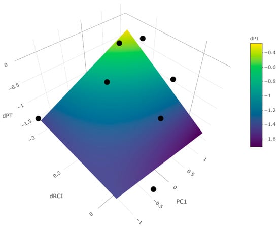 Context dependent change may be common in urban catchments [63], and we found some evidence for environmental contingencies in diatom responses to forest buffers. Increasing urbanization (PC1) weakened the potential for change in riparian habitat (ΔRCI = dRCI) to influence the reduction in %PT (ΔPT = dPT). Each point represents a site pair (unbuffered and buffered sites) in the Oslo basin.