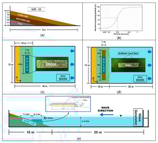 The experiment was conducted in a 12 m (W) × 1 m (H) × 30 m (L) section of a large-scale 3D wave flume. The incident wave was simulated using a piston-type wave generator, which can generate regular waves and irregular waves. A wave absorber, which was formed from an inclined porous structure to prevent the re-reflection of waves, was installed on the opposite side of the wave generator. For the stable induction of the experimental wave generated from the wave paddle, the flume was designed to have no inclination from the wave paddle to 20 m. After 10 m, the flume contained 20 cm of gravel at the bottom, 20 cm of non-filtered sand in the middle, and 10 cm of filtered sand at the top to create a 1/20 slope, as shown in Figure 1a. Sand with an average particle size of d50 = 0.2 mm was used for the top layer, and the grain size accumulation curve is shown in Figure 1b. The submerged breakwater was installed by staking in the sequence of 8 cm of sand-filled geotextile at the bottom and 8 cm of dolos at the top of geotextile. The experiment was performed for two cases, namely one where the submerged breakwater was installed and one where the hybrid method (i.e., the submerged breakwater with an artificial coral reef) was employed, as shown in Figure 1c,d respectively. The specifications for the structure installation are shown in Table 1, where B is the structure width, L is the structure length, H is the structure height, R is the crown depth, and Y is the offshore distance as shown in Figure 1e. The hydraulic model experiment was conducted for Case 1 with 1.00 m (B) × 0.16 m (H) × 6.00 m (L) of submerged breakwater and for Case 2 with 1.00 m (B) × 0.10 m (H) × 2.00 m (L) of artificial coral reef (Table 1).
