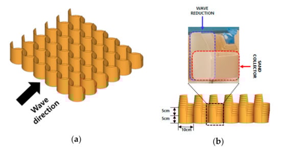 Figure 2 shows the artificial coral reef applied in the hybrid method. The artificial coral reef, which was developed based on the motif of a coral reef to prevent coastal erosion, entails a flexible construction method. It has a flexible structure, is constructed from high-density polyethylene, and contributes to both a reduction in environmental pollution and an aesthetic landscape [27]. The structure is divided into a wave reduction part and a sand collector part, which reduces the height of incident waves and collects escaping sand, respectively.