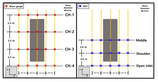 To reduce the visual and environmental impacts of these problems, submerged structures were introduced in the 1980s. Such structures are installed below the water surface, and they perform the wave energy attenuation and erosion without harming the natural landscape [21,22,23]. However, waves generated through open inlets cause localized scour in the front, at the shoulder, and at the outlet of the submerged breakwater [24,25]. These scour phenomena not only have a significant influence on the settlement and stability of the structure, but also can inhibit its function [26]. Therefore, alternative methods for alleviating the problems associated with existing structures are needed. This study focused on overcoming the limitations arising from erosion at open inlets owing to scour and rip currents caused by the downdrift generated in submerged breakwaters. To solve the problem of existing submerged breakwaters, we performed a large-scale 3D hydraulic model experiment. In particular, this experiment introduced a hybrid method that combines an existing submerged breakwater with an artificial coral reef. Through movable bed experiments, we analyzed the characteristics of sediment transport and morphological changes in the bed; further, we evaluated the feasibility of the hybrid method to determine the role of artificial coral reefs in wave attenuation and prevention of erosion and scour by analyzing changes in the coastline and flow rate when the hybrid method was applied.