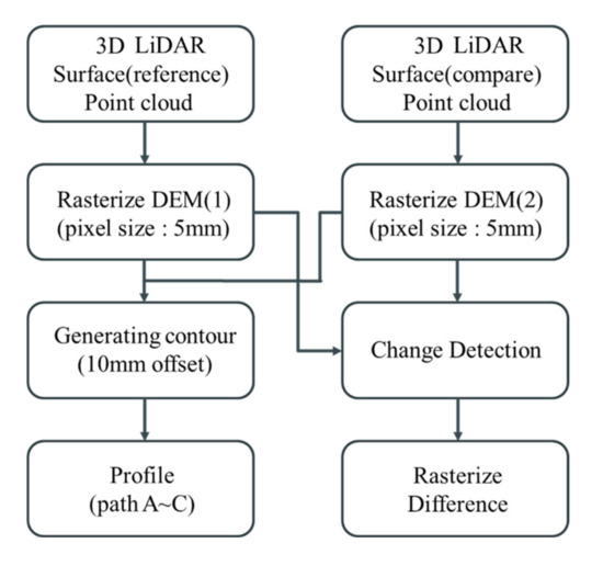 We conducted an analysis after matching the shapes to each data point (before wave generation at approximately 20 h) to unify the coordinate system. Noise points and out-of-range points were prepared by applying the ICP after data calibration. For data validation, we rasterized the volume change by calculating the volume for a part of the area that had no morphological changes. For the error in the region that did not change after data verification with the mean and standard deviation, we analyzed the contour and path profile after confirming that the machine error was within 2 mm (Figure A1).