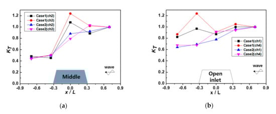 Figure 5 shows the wave distribution at the top of the structure when the submerged breakwater and hybrid method are applied. The horizontal axis represents x/L and the vertical axis represents the wave transmission rate (KT). The wave transmission rate is calculated using Equation (2), where Hi is the incident wave height and H′ is the wave height at the measurement point.
