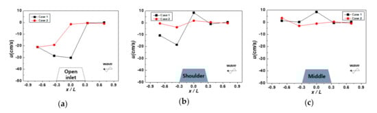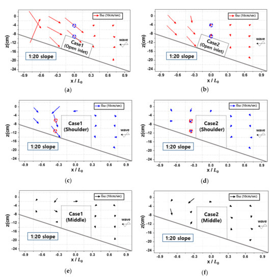Figure 7a,b shows the average flow rate (xz) at the open inlet. A strong flow exiting offshore behind the structure occurred owing to the increased flow rate in the open inlet. This increased flow rate was the result of differences in the average water level in Cases 1 and 2. However, in Case 1, a strong offshore flow occurred, while in Case 2, a relatively small flow distribution was observed. This caused a significant reduction in the flow rate at the location of x/L = 0 cm. In Case 2, the overall flow was greatly reduced, and in Case 1, a strong flow occurred in the offshore direction and downward along the slope near x/L0 = −0.3. This was attributed to the strong breaking wave that occurred on the crest of the structure, the average water-level rise behind the structure after breaking, and the offshore flow that occurred through the open inlet because of the difference in the average water level from the wave setup onshore and offshore. Accordingly, the strong flow at the shoulder and open inlet of the structure in Case 1 was thought to cause scour and erosion around the structure. In contrast, a decrease in the flow at the open inlet and the shoulder of the structure via the application of the artificial coral reef method (Case 2) could mitigate sediment transportation.