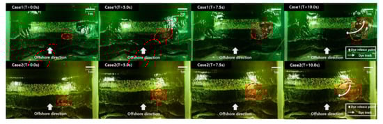 To qualitatively determine the flow that traveled from behind the structure to the open sea, it was tracked using a dye. Figure 8 shows the results from 0 s to 10 s for the flow of dye injected behind the shoulder of the structure as measured by a drone. As shown in the flow distribution at 5 s in Case 1, the flow predominantly moved toward the right, and the flow in the offshore direction developed in the open inlet and exited through the inlet at approximately 10 s. This was a general indication of a strong flow through the submerged breakwater to the open inlet. This strong flow could cause local scour and erosion behind the structure. However, when the hybrid method was applied, the flow exiting through the open inlet was relatively mitigated compared with that in Case 1. From the experiments, the application of the hybrid method could mitigate the problems of local scour and the erosion that generally occurs around submerged breakwaters. It could also improve the function of the submerged breakwater itself. Therefore, the hybrid method proposed in this study was determined to be applicable not only for general submerged breakwaters, but also for various structures for controlling coastal erosion.