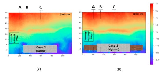 Results of the 3D morphological changes after 20 h by structure type (Case 1: dolos; Case 2: hybrid (dolos with the coral reef)): (a) morphological changes after 20 h when the submerged breakwater was applied (Case 1) and (b) morphological changes after 20 h when the hybrid method was applied (Case 2).