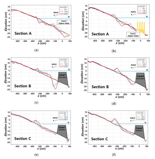 Based on wave and velocity distribution analysis in Section 3.1 and Section 3.2, the flow was generated from the side part to the rear part of the structure due to the wave radiation stress gradient since the distribution is relatively low in the center part behind the structure rather than the side part. This phenomenon would lead to the shoreline retreat from the open inlet and the shoreline advance behind the structure at the same time. We measured the slow rate of flow because the radiation stress gradient was relatively low between the open inlet and center part of the structure in Case 2 rather than in Case 1. In addition, the blue areas shown in Figure 9a denote erosion and scour, which occurred behind the shoulders and open inlet of the structure. This is because a strong return flow occurs as a result of the differences in the mean water level, depending on the wave setup, at the open inlet and shoulder of the structure, as described in Section 3.2. This rise in the water level behind the structure is a fatal drawback of the submerged breakwater. Due to the water level rise, return flow was generated for energy equilibrium, which led to serious erosion and scour around the structure. However, in Case 2, the erosion around the structure could be mitigated because the return flow was reduced while allowing the flow over the artificial coral reef. Compare with Figure 9a (circle area), it can be seen that the blue area, which describes the area of erosion and scour, was diminished around the structure as shown in Figure 9b, which demonstrates the beneficial role of artificial coral reef to conserve the seabed. To analyze the erosion and scour precisely, we investigated cross-sections dependent on the morphological changes. These were divided into those corresponding to the open inlet (section A), shoulder (section B), and middle of the structure (section C).