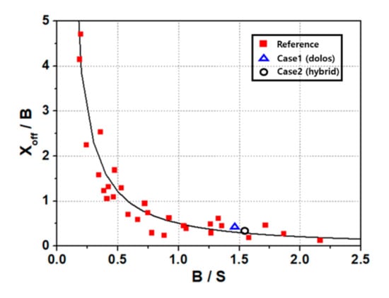 Various technologies have been developed to address coastal erosion, and many studies have been conducted on shoreline response dependents on the type of structure. Black et al. [33] suggested an equation for predicting the salient and tombolo dependence on the ratio of the structure length (B) and the distance from the undisturbed shoreline (S). Equation (5) presents an empirical-based relationship for the shoreline response to the reef. Xoff and Yoff were estimated using Equation (5) to compare and evaluate the theoretical results (Table 4). Herein, Xoff and Yoff represent the distance from the tip of the salient to the offshore obstruction and the salient amplitude, respectively (Figure A2). In addition, S presents the sum of Xoff and Yoff. We computed Yoff by calculating undisturbed line (S) without disturbance at the center of the structure based on morphological change data in Figure 9. Figure 11 shows the coastline response results for the submerged breakwater and hybrid method, and the power–curve relationship is distributed within a certain range. In Case 1, this comparison revealed that the measured value of Xoff was approximately 22% larger than the reference value. This result indicated that more time was required to reach a stable shore condition, despite setting 20 h as the threshold for a stable shore in the experiment where no topographical changes occurred. In addition, the particle diameter of the experimental sand was 0.2 mm, which was considered to be a large diameter for topographical change. In Case 2, the measured value for Xoff was approximately 17% larger than the reference value. In this case, the S value decreased to reduce Xoff, which led to the advancement of the shoreline. This occurred because the disturbed area was reduced owing to wave control in the open inlet, which was caused by the application of the artificial coral reef. In general, it was found that the similarity of the hydraulic model experiment exhibited a small error range compared with the Xoff value under field conditions; further, it well-reproduced the field conditions. However, Equation (5) represents only the coastline change with respect to the structure length and detached distance, and it does not consider the wave height, structure width, and floor depth. Therefore, we intend to conduct further studies on the response of the shoreline dependence under various conditions.