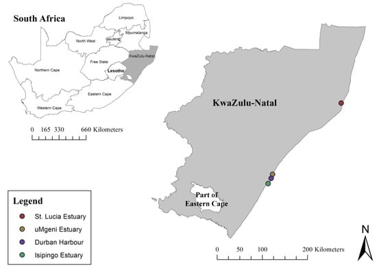 - Forbes, A.; Demetriades, N. Estuaries of Durban, KwaZulu-Natal, South Africa; Report Prepared for the Environmental Management Department, eThekwini Municipality; Marine & Estuarine Research: Durban, South Africa, 2008; pp. 1–228. [Google Scholar]