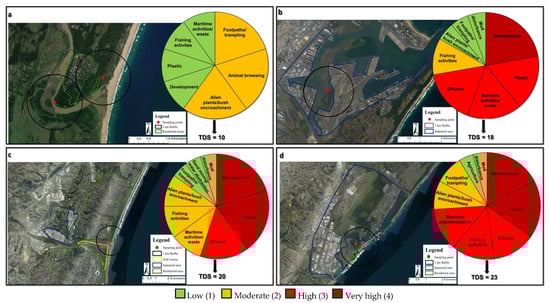 Land use types surrounding (within 5 km) each estuary and pie charts showing the types and severity of disturbances impacting on them. The pie chart reflects the proportional contribution of each disturbance type to the total disturbance score (TDS; potential maximum of 48) for the (a) St. Lucia, (b) Durban Harbour, (c) uMgeni and (d) Isipingo estuaries. The TDS is the sum of the average score for 12 disturbance types, scored in terms of severity (from 1 to 4) by three observers on each of four days (n = 12) at each site.