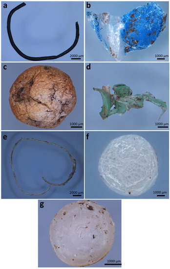 Microplastic morphotypes found within the four estuaries sampled: (a) Fibre; (b) film; (c) foam; (d) fragment; (e) monofilament line; (f) microbead; and (g) pellet.