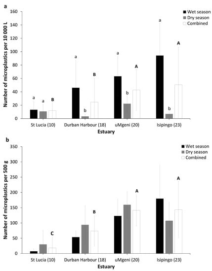 In addition to disturbance and land use, mouth status and seasonality also appeared to have influenced MP concentrations: The two most disturbed systems (i.e., Isipingo and uMgeni) that exhibited the highest MP concentrations (Figure 5) are predominantly open systems while the moderate (Durban Harbour) and least (St. Lucia) disturbed systems are an estuarine bay and estuarine lake, respectively (Table 1). In estuaries, hydrological factors such as increased river flow (due to rainfall) play an important role in the level of MP pollution, particularly in surface water (Figure 5a), as MPs in freshwater and estuarine systems are thought to largely emanate from local urban run-off and wastewater effluent []. For example, Lima et al. [] reported almost three times higher MP loads during the wet season in a Brazilian estuary while Gündoğdu et al. [] reported 14 times higher MP loads in Mersin Bay, Turkey, following flood events. In corroboration, the MP concentration in this study was three to fourteen times higher during the wet season in surface waters of the three urban estuaries (Figure 5a), all of which are known to receive large storm water inputs [].