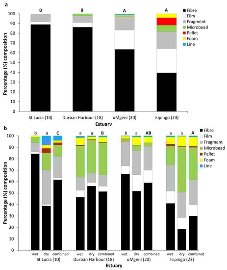Proportional distribution of microplastic for (a) surface water (n = 12 per estuary, seasonal data pooled due to no significant differences between seasons) and (b) mangrove sediment (n = 9 per season, per estuary) at the four estuaries sampled. Uppercase letters indicate significant differences in the proportional distribution of microplastic (MP) types across estuaries based on combined seasonal data (p < 0.0001 in both (a) and (b); ANOVA). Lowercase letters indicate significant differences in the proportional distribution of MP types between seasons within each estuary (p = 0.02 in (b); ANOVA). The total disturbance score (TDS) is given within brackets for each estuary on the x-axis.