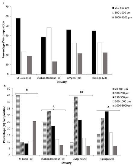 In terms of size class distribution of the MPs, there was a significantly greater proportion of smaller MPs in both water and sediment overall (p < 0.0001 in both cases; ANOVA). Microplastics smaller than 500 µm formed 47% and 75% of the total MP pools in water and sediment, respectively. The size distribution of MPs was similar across estuaries in the water column (Figure 7a). Most estuaries contained a higher proportion of smaller (250–500 µm) MPs in water. There was, however, a significant difference in the size distribution of MPs in sediment across estuaries, with the least disturbed system (St. Lucia) exhibiting the highest proportion (45%) of MPs in the smallest size class (20–100 µm) (Figure 7b).