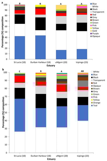 Proportional distribution of different coloured microplastics for (a) surface water (n = 12) and (b) mangrove sediment (n = 18) at the four estuaries sampled. Uppercase letters indicate significant differences in the proportional distribution of different coloured MPs across estuaries based on combined seasonal data (p < 0.0001 in both (a,b); ANOVA). The total disturbance score (TDS) is given within brackets for each estuary on the x-axis.