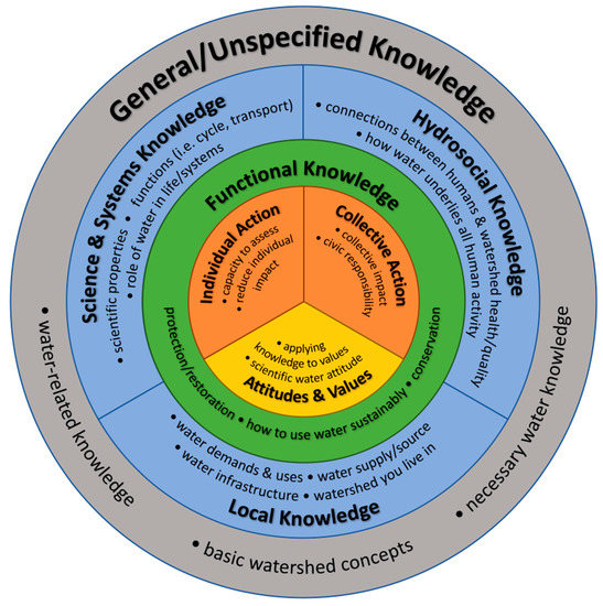 However, such vagueness also sacrifices the ability to easily compare water literacy among locations and populations. Thus, most authors expand upon the details and information that should constitute water literacy, particularly within the cognitive domain. Three cognitive knowledge sets are depicted in Figure 1 by the second ring of blue circle segments. The first we termed science and systems knowledge, which is based on water’s unique scientific properties and its significance for living systems, including the water cycle and water’s ability to transport dissolved and solid materials. This category encompasses ecosystem needs and flows, with five definitions [22,28,30,31,35] mentioning the role of water in life and one explicitly advocating for knowledge of interconnected aspects like “air, water, and/or biodiversity” [22] (p. 7). In addition, six definitions address hydrological processes, cycles and functions [7,18,28,31,33,38], but only three specify that water literacy includes knowledge at the level of water’s chemical and physical properties [27,31,40]. Interestingly, four definitions call specifically for an understanding of “watershed concepts” [36] (p. i) or ability to define watersheds [18,29,35]. Sources emphasizing science and systems knowledge imply that a base understanding of hydrologic and ecologic science along with systems thinking is needed for application within broader, overarching water issues [27].