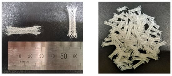 For SP removal during wastewater treatment, we used MTF media consisting of synthetic textiles and LDPE provided by KEOSONG Construction Co., Ltd. (Goyang-si, Gyeonggi-do, Korea) [9]. The length of the mesh tube is 25 mm and the diameter is 5 mm. A net of rhombus grids makes up the wall of the tube, with several strands of cilia at each end of the tube. The net size of the rhombus lattices is 0.75 × 0.85 mm and the bulk density and density of the packed tubes are approximately 0.06 g/cm3 and 520 ea/L, respectively. The porosity of the filter bed filled with the mesh tube filter media is approximately 0.896 (±0.005) [9]. Photographic images of the filter media are shown in Figure 1.