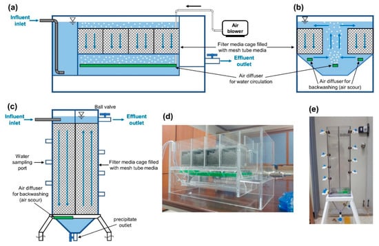 Cross-sectional diagram and photographs of two types of vertical-flow roughing filter: (a) mesh tube filter (MTF) section in the direction of water flow, (b) MTF cross-section in the direction perpendicular to water flow, (c) porous filter bed (PFB) section in the direction of water flow, (d) photograph of MTF reactor, (e) photograph of PFB reactor.