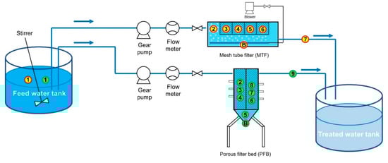 - In the extended performance analysis of a 72 h operation using blended influent water comprising natural seawater and secondary treated wastewater, PFB again showed better and more stable SP removal performance than MTF. Moreover, air scouring-based backwashing effectively removed SPs deposited on the mesh tube media. Although MTF and PFB have low organic-SP removal performance, relatively hydrophobic SPs were more efficiently deposited on the mesh tube due to the hydrophobicity of the mesh tube.