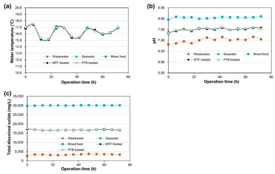 Laboratory-scale experiments using artificial seawater and kaolin particles confirmed that PFB removed SP more effectively than MTF and showed better SP removal performance at an ion concentration above 18,000 mg/L than when the ion concentration was almost zero. However, laboratory-scale experiments have limited influent capacity, making it difficult to increase the operating time. Therefore, field experiments were conducted at Yeosu wastewater treatment plant (Yeosu-si, Jeollanam-do, Republic of Korea) to analyze the SP removal characteristics and organic pollutants during more than 72 h of MTF and PFB operation. To analyze whether MTF and PFB effectively remove organic SP under high ion concentration conditions, the influent was set to a 1:1 blended solution with secondary treated wastewater from the Yeosu wastewater treatment plant and natural seawater drawn from the shore next to the plant. The influent water temperature was 15–17.5 °C, the pH was 7.5, and the TDS was approximately 17,000 mg/L (Figure 4). In addition, as the TSS of the influent was very low, kaolin particles were periodically administered to maintain the TSS concentration of the influent at 20 mg/L to analyze the performance of SP in MTF and PFB. In the seawater desalination process, the process using influent water mixed with secondary treated wastewater and seawater meets the global trend of water reuse and has several advantages: (1) seawater intake and discharge requirements are reduced, (2) second-pass RO for boron control is no longer required, (3) energy consumption is reduced, (4) seawater and treated wastewater constituents are diluted in the brine to be disposed (5) the land footprint is reduced, and (6) pumping volumes are decreased [43,44]. However, the water reuse process that mixes wastewater and seawater has a high risk of causing fouling in the water treatment process due to the high concentration of SP and organic particles contained in the wastewater; another disadvantage is that it cannot be used as drinking water due to environmental regulations in many countries [44].