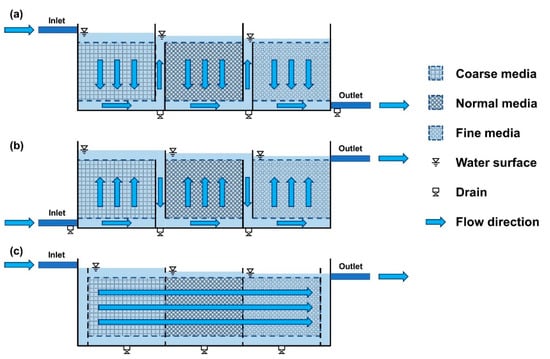 Schematics of horizontal and vertical roughing filters: (a) down-flow roughing filter, (b) up-flow roughing filter, and (c) horizontal-flow roughing filter [4,5,11].