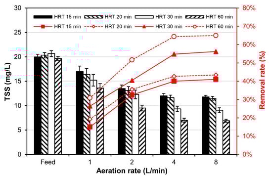 Prior to conducting experiments comparing the filter performance of bench-scale MTF and PFB reactors, SP removal tests were performed as a function of aeration rate (1, 2, 4, and 8 L/min) to obtain the optimal aeration rate of MTF. According to the tests, under a hydraulic retention time (HRT) of 60 min, the SP removal rate was approximately 30% or more at an aeration rate of 1 L/min, 50% or more at an aeration rate of 2 L/min, and 65% or more at an aeration rate of 4 L/min (Figure 6). At an aeration rate of 8 L/min, the SP removal rate was similar to that at 4 L/min. The SP removal rate also increased with increasing aeration rate under other HRT conditions; however, the rate of SP removal increase slowed at aeration rates above 4 L/min. A previous study suggested that this phenomenon was due to the SP floc becoming separated from the mesh tube media and being redistributed into the water at a high aeration rate of 4 L/min or more [10]. In addition, the higher the aeration rate, the higher the flux of air bubbles in the MTF, which eventually breaks the SP floc into smaller pieces, reducing the ability of MTF to remove SPs. The same study determined the optimal aeration rate of a bench-scale MTF as approximately 3 L/min [10], whereas this study obtained an optimal aeration rate of approximately 4 L/min.