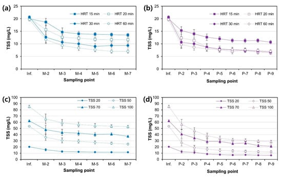 SP concentration at each port of the bench-scale MTF and PFB reactors as a function of influent flow rate and SP concentration: (a) total suspended solids (TSS) of MTF (flow rate conditions); (b) TSS of PFB (flow rate conditions); (c) TSS of MTF (TSS concentration conditions), and (d) TSS of PFB (TSS concentration conditions). Each sample was analyzed three times to derive the data reliability and standard deviation.