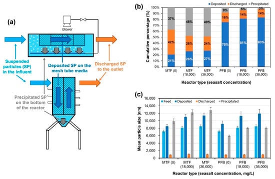 SP mass balance of bench-scale MTF and PFB reactors as a function of ionic concentration (artificial sea salt concentration: 0, 18,000, and 36,000 mg/L): (a) schematic diagram of mass balance; (b) deposited/discharged/precipitated particle ratio under each condition; (c) mean SP sizes under each condition.