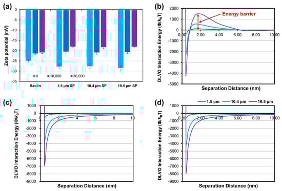 Zeta potential of SP and Derjaguin, Landau, Verwey, and Overbeek (DLVO) interaction energy curves between filter media material and SP: (a) zeta potential of SP; (b) DLVO interaction energy curves for an ion concentration of 0 mg/L; (c) 18,000 mg/L; and (d) 36,000 mg/L.