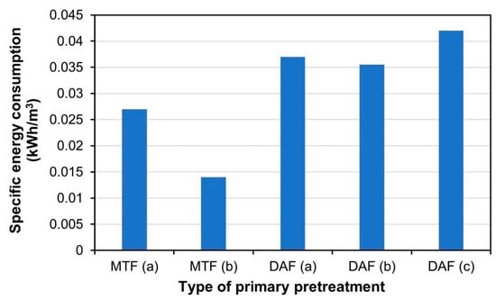 where Pw is the daily power consumption (kW), Q is the recycling water flow rate depending on the recycle rate (m3/d), ρ is the water density (1000 kg/m3), g is a gravitational constant (9.81 m/s2), h is the pressure drop depending on the saturation pressure (m head), and η is the pump efficiency, which is assumed to be 70%. Dividing the Pw value by 24 (h) gives the energy consumption per hour (kWh), which, when divided by the water production quantity (m3/h), gives the specific energy consumption (SEC). In order to compare the SEC of DAF, MTF, and PFB, SEC data obtained by three batch DAF operation conditions [10] and pilot-scale MTF and PFB operation conditions (Table 2) are shown in Figure 10.