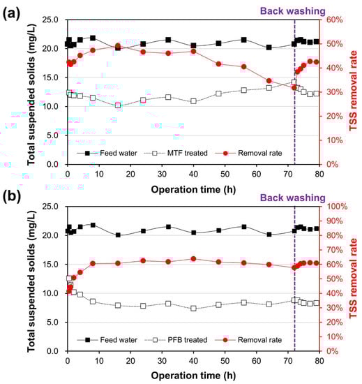 SP removal performance of MTF and PFB in a wastewater-seawater mixture: (a) TSS removal rate of MTF and (b) TSS removal rate of PFB.