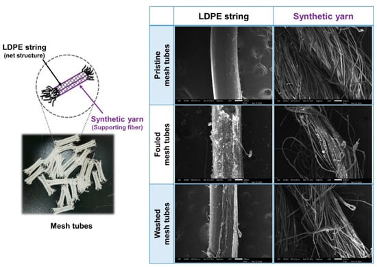 The surface of the mesh tube media was photographed with a low-vacuum scanning electron microscopy (LV-SEM) to compare the pristine mesh tube media with contaminated media and media washed by backwashing to visually observe the contamination and cleaning properties of the mesh tube media (Figure 12). As described in the materials and methods part, the mesh tube is composed of a lattice structure made of LDPE that contains four strands of synthetic yarn to support the polyethylene lattice during the mesh tube manufacturing process. The polyethylene string constituting the lattice structure of the mesh tube media has a relatively thick and smooth surface, and the synthetic yarn has a rough surface with a thick thread intertwined with fine threads. It is predicted that a lot of SP will be deposited on the synthetic yarn due to its more complex surface structure than the LDPE string; however, the LV-SEM observations indicate the opposite. The surface of the fouled mesh tube media reveals many SPs attached to the simpler structure of the LDPE string than the synthetic yarn. This can be explained by the aforementioned theory of DLVO interaction energy, whereby LDPE encourages the effective deposition of negatively charged SPs by converting the zeta potential into a positive charge at high ion concentrations. In addition, as the SPs adhering to the smooth surface are effectively separated from the surface of the mesh tube media during backwashing, this characteristic is expected to facilitate maintenance of the mesh tube media filter