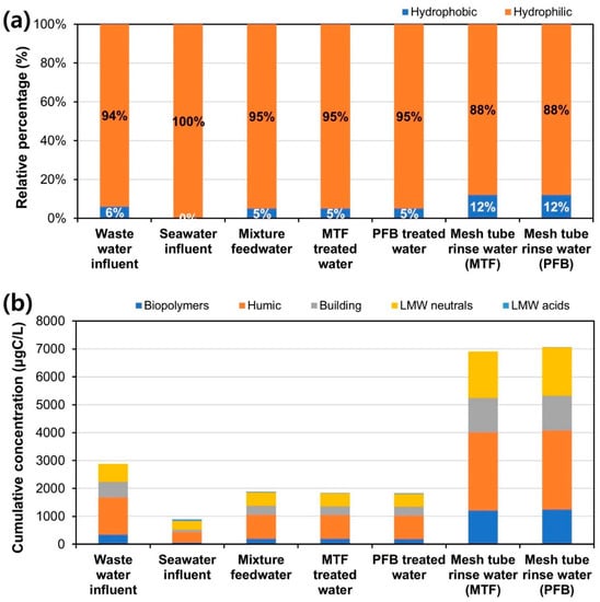 LC–OCD was used to analyze the characteristics of organic pollutants contained in the influent, MTF-treated water, and PFB-treated water, as well as organic pollutants deposited on the surface of the mesh tube media (Figure 13). LC–OCD can calculate the hydrophobicity ratio of organic SPs and the ratio of each fraction of pollutants. The hydrophobic ratio was 6% and the hydrophilic ratio was 94% in secondary treated wastewater of the Yeosu wastewater treatment plant, whereas the hydrophilic ratio was 100% in the seawater intake from Yeosu seashore (Figure 13a). Blended wastewater–seawater influent had a hydrophobicity ratio of 5% and a hydrophilicity ratio of 95%, with no difference in the hydrophobicity/hydrophilicity ratio between the influent water and the treated water of MTF and PFB. However, in order to analyze the characteristics of organic contaminants deposited on the mesh tube media, the rinsed water of both MTF and PFB was analyzed using LC–OCD, revealing hydrophobicity of 12% and hydrophilicity of 88%. The hydrophobicity ratio of the organic SP attached to the mesh tube media increased from that of the SP in the influent because the hydrophobic biopolymer was more effectively attached to the polyethylene mesh tube media than the hydrophilic biopolymer (Figure 13b).