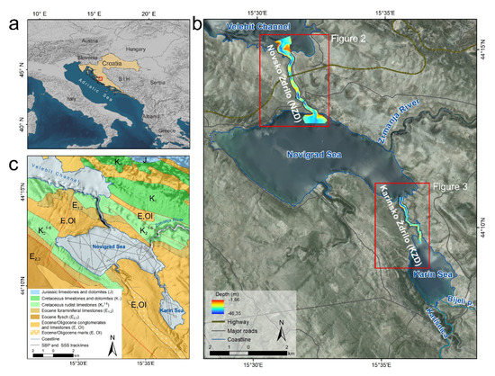 48]. Prior to the rapid Pleistocene−Holocene transgression, the present-day Novigrad and Karin Seas acted as karst poljes. They were subsequently submerged, creating a typical drowned karst landscape together with the drowned canyon of the Zrmanja River [