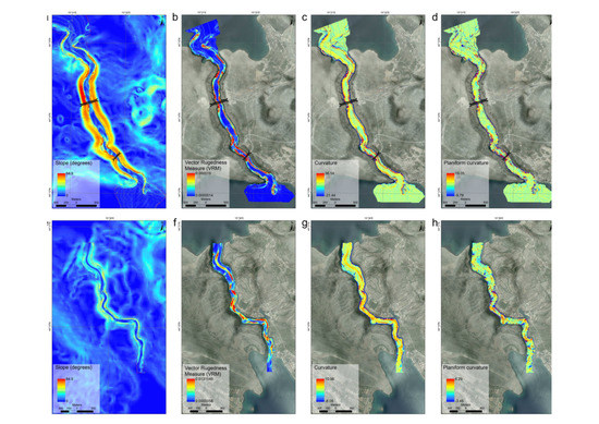 51]. The curvature can be calculated parallel to the slope (profile curvature), where it describes the acceleration or deceleration of the flow, or perpendicular to the slope (plan or planiform curvature), which describes the convergence or divergence of the flow. The planiform curvature can be useful when defining ridges, valleys, and slopes along the side of the features [