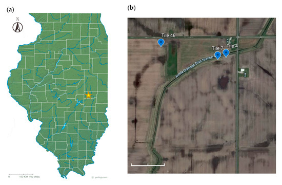 The study site is located in Douglas County in east-central Illinois (Figure 1) where a replicated tile drainage study based on timing of fertilizer N application was being conducted [36]. The field is under no-till and strip-till practices and has been used to grow corn and soybeans in simple rotation. To demonstrate there were no statistically significant responses resulting from the N treatment or crop phase on DRP concentration, DRP loads, or tile discharge, an analysis of variance was performed using linear mixed models with N treatment as the fixed effect and block as the random effect (data not shown). Tile lines #4, #7 and #46 were selected for monitoring P loss. The three tiles drain 1.95, 1.86 and 1.63 hectares, respectively. To facilitate the drainage of soils for crop growth, the construction of drainage ditches and tile pipes started from 1878 [37]. The sites received diammonium phosphate (18-46-0) at the rate of 22.4 g/m2 every other year following soybean until 2016; however, no P fertilizer was applied from 2017 through 2020. Anhydrous ammonia was applied to corn at the rate of 20.2 g/m2 in spring 2020.