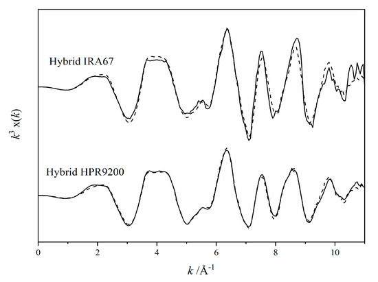 Results of linear combination fitting of X-ray absorption spectroscopy (XAS) spectra of reference compounds on the spectra of hybrid HPR9200 (HR1) and hybrid IRA67 (HR2). Black solid line and dashed line represent the normalized k3 weighted XAS spectra and fit, respectively. HR1 is 100% goethite (R-factor: 0.01) and HR2 is 82 ± 4% goethite and 18 ± 2% hematite (R-factor: 0.06).