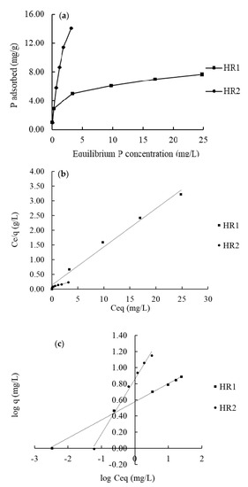 The P adsorption isotherms for the hybrid resins are shown in Figure 3a. The HR2 adsorbed more phosphate than HR1 at each initial P concentration. The isotherm curves were fitted well (R2 > 0.98) to both the Freundlich (Figure 3b) and the Langmuir (Figure 3c) models. The P adsorption capacity of HR1 calculated from the Langmuir model was 7.69 mg/g, while that of HR2 was 19.84 mg/g for HR2 (Table 2).