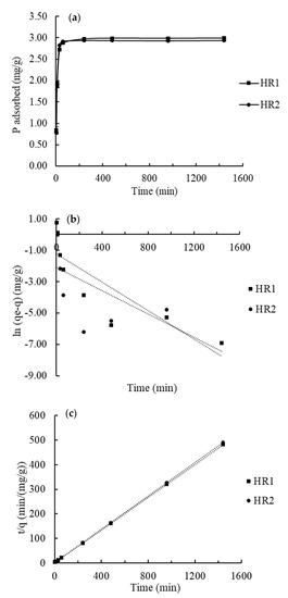 where is the amount of phosphate adsorbed per unit weight of adsorbent (mg P g−1) at time t (h), is the adsorption capacity of adsorbents (mg P/g) at equilibrium, (g/mg/h) is the first order rate constant, and the terms, and , were calculated by linear regression of vs. .
