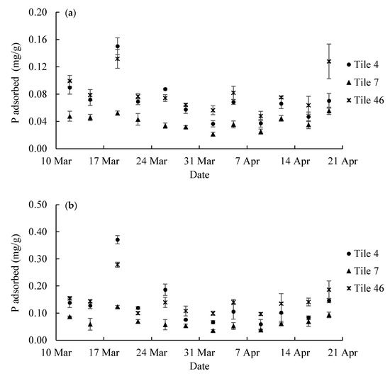 Based on the DRP concentrations that were calculated with RF and volumes of water flow, TP load in each sampling period was calculated (Table 8). Different P loads were observed from three tile lines (p < 0.05). According to the HR1-sampling data, tile 4, tile 7, and tile 46 released P at the rate of 0.53 ± 0.01, 0.18 ± 0.00, and 0.39 ± 0.01 g/day, respectively. Since tile 4, tile 7, and tile 46 cover 1.95, 1.86 and 1.63 hectares of drainage area, respectively, they discharged 0.27 ± 0.01, 0.10 ± 0.00 and 0.24 ± 0.01 g of P per hectare per day, respectively. The data from HR2-sampling were slightly higher. They were 0.33 ± 0.00, 0.11 ± 0.01 and 0.25 ± 0.01 g/ha/d from tile 4, tile 7 and tile 46, respectively. In addition, the P discharge during the flooding event (19–21 March) released 44.8–64.8% of TP load in the three tiles during the six-week monitoring period. It showed the importance of high flow events on the loss of P from agricultural drainages, which is in accordance with previous studies [4,58,59,60].