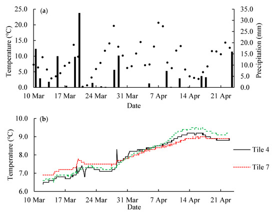 Weather conditions in Spring 2020 at the study site in East-Central Illinois, USA. (a) Daily air temperature shown in dots and daily precipitation shown in columns; (b) tile water temperature.