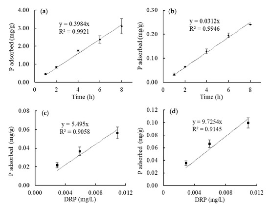 Laboratory calibration experiments using (a) HR1 and (b) HR2. The dashed lines show the linear fitting of the amount of P adsorbed with different adsorption time. Laboratory sampling rate, RL, for HR1 and HR2 is calculated to be 0.1992 and 0.0156 L/h, accordingly. (c,d) Shows the result of field calibration experiments using HR1 and HR2, respectively. The dashed lines show the linear fitting of the amount of P adsorbed with the DRP concentration of the tile water. Field sampling rate, RF, for HR1 and HR2, is 0.0763 and 0.1351 L/h, respectively.