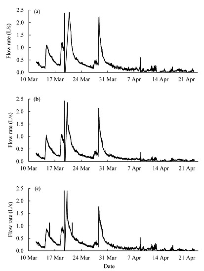 Each tile was fitted with an inline water level control structure containing a stoplog with a 45° V-notch weir (Agri Drain Corporation., Adair, IA, USA). Water depth and temperature were recorded every 15 min using a Water Level Datalogger Model 3001 (Solinst, Georgetown, ON, Canada). Flow rates were determined using a discharge equation for inline water level control structures described by Chun and Cooke [38]. Approximately 50 mm of rain on 19–20 April caused flooding in the receiving agricultural ditch which submerged all tiles and elevated water height by more than 1 m in each water level control structure. To be conservative, flow rate was adjusted to 0 L/s immediately following water heights that generate the maximum tile flow for each tile (approximately 2.5 L/s). When the water level in each water control structures began to decline, flow was assumed to resume until the height returned to the maximum discharge rate.